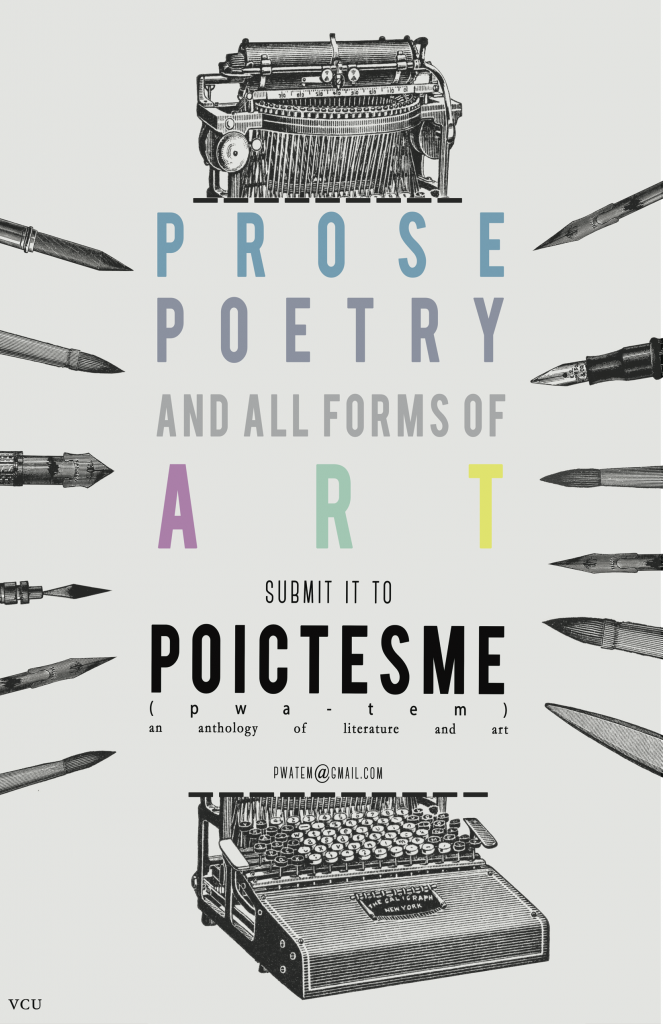 We’re excited to announce that Poictesme is now accepting submissions for our upcoming 2015-2016 journal! VCU has lots of talented artists and writers, and we want your artwork, prose, and poetry, so that it can be featured in our next anthology. You can submit as many pieces as you want, and we’ll look at each individually. […]